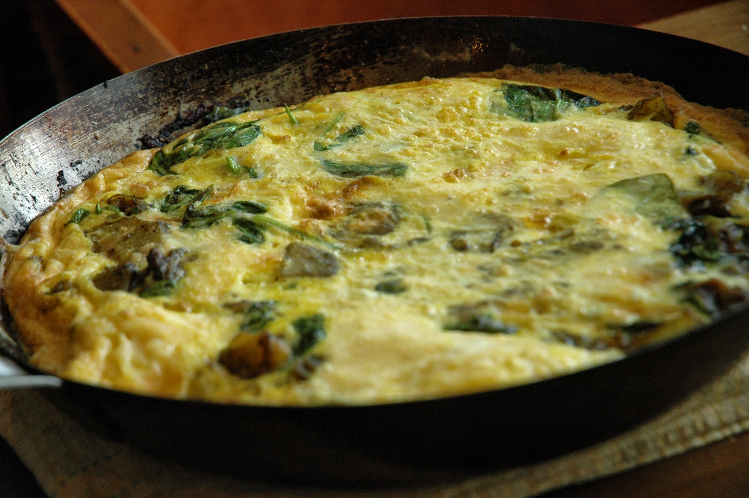 1 maço de manjericão -2 punhados de espinafre -200g de champignon paris fatiado -250g de ricota -8 ovos -azeite, pimenta moída na hora, sal