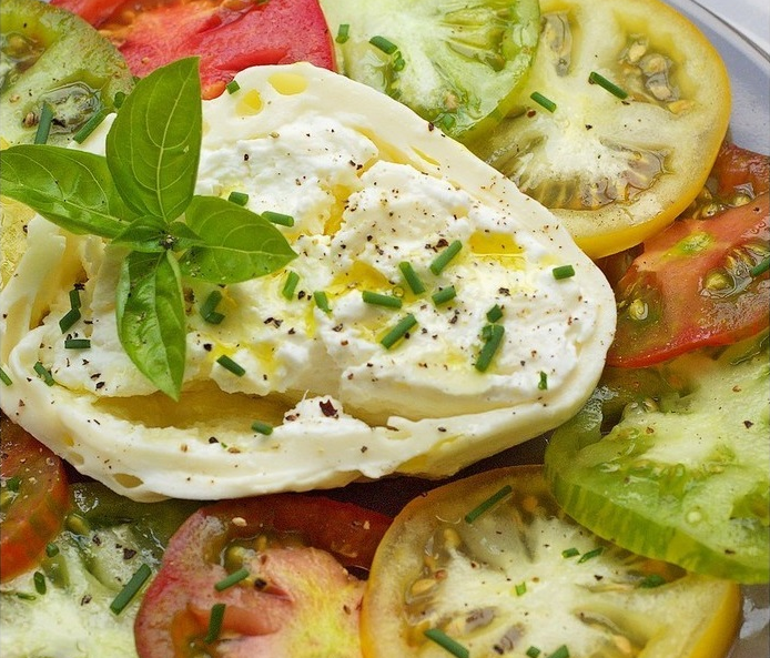 Burrata é um queijo fresco italiano, feito de mussarela e creme. A camada externa é mussarela sólida enquanto o interior contém mussarela e um creme de leite, dando-lhe, uma textura macia. Deve ser consumida o mais fresca possível para aproveitar toda sua cremosidade. Em Puglia, terra da Burrata, entre as aldeias de Andria e Corato, ela é fabricada a noite para ser vendida no dia seguinte de manhã.