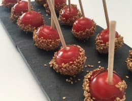 No Apéro de hoje uma receita romântica, inspirada na maça do amor da nossa infância.. Estes tomates não levam nem 15 minutos para fazer,…