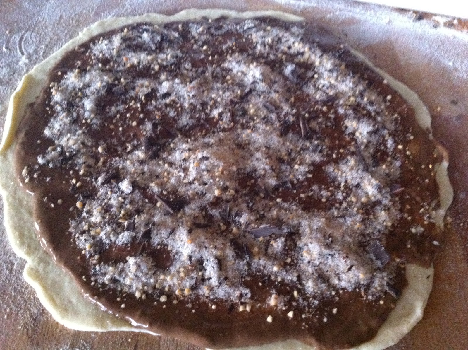 Retire uma bola de massa de cada vez da geladeira e abra em uma superfície lisa bem enfarinhada. Enfarinhe também o rolo para que a massa não grude. Abra em um formato circular do tamanho de um prato (se for preciso coloque um prato por cima da massa e corte) é importante que ela fique redondinha como uma pizza. Passe a misture do creme de chocolate por toda a massa e depois salpique com a misture de chocolate, nozes e açúcar.