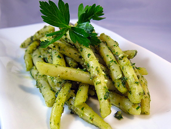 Corte fora as extremidade das vagens, e corte-as na metade se foram muito grandes. Corte as alcaparras em pedaços pequenos. Misture todos os ingredientes e leve a geladeira até a hora de servir.